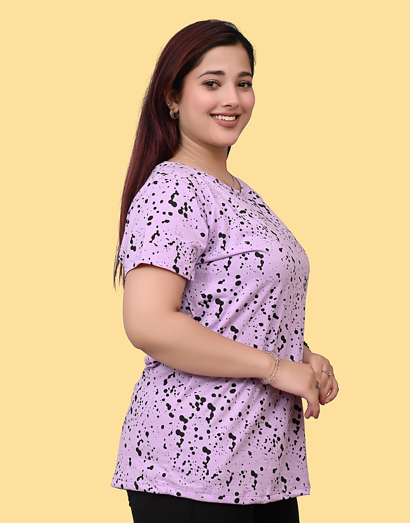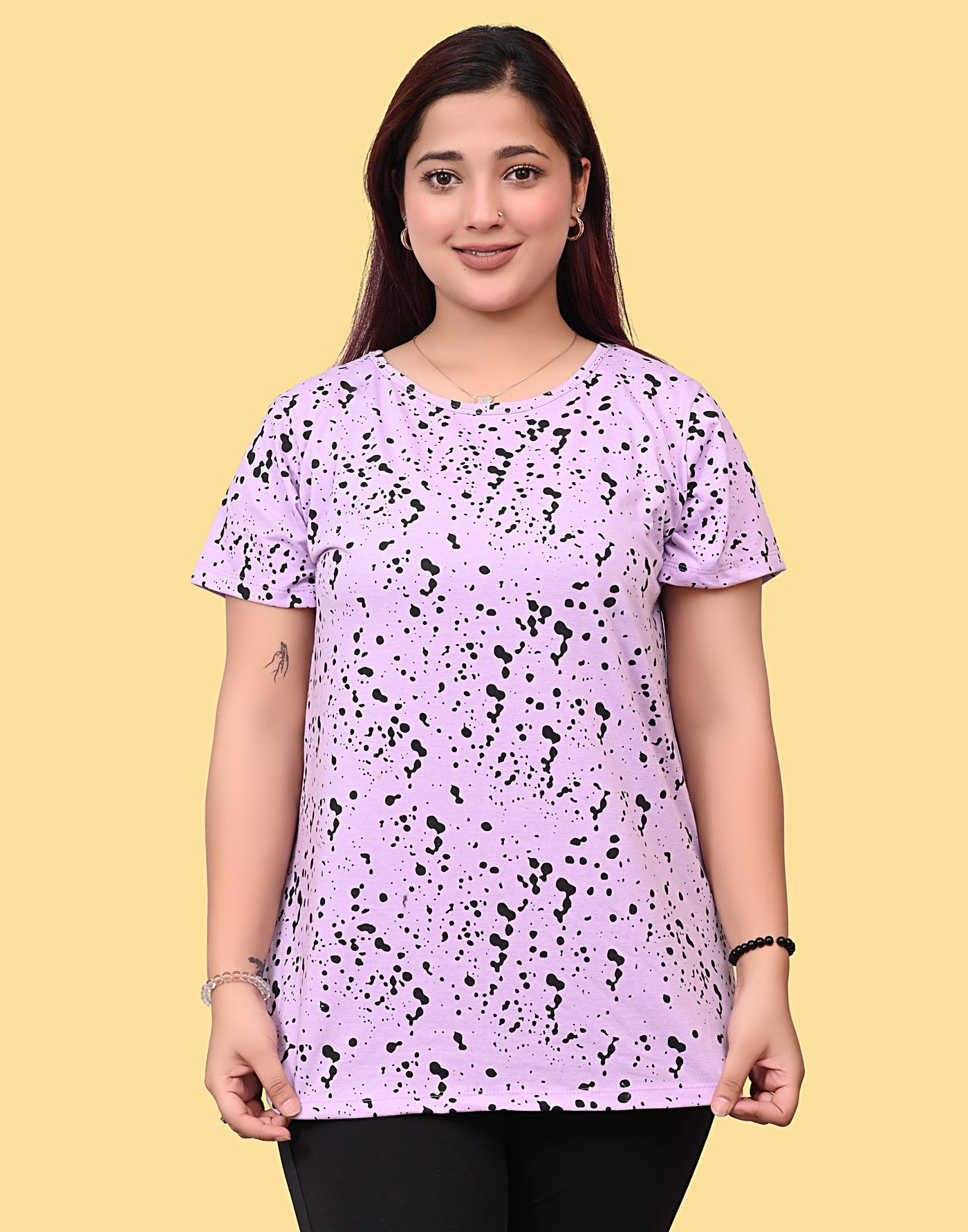 Add a soft yet bold element to your wardrobe with this lavender T‑shirt featuring striking black abstract motifs. Made from 100 % pure cotton, this tee offers breathable comfort and artistic flair—perfect for brunches, casual outings, or weekend wear.